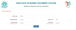 - यहां आपको 10वीं या 12वीं जिस क्लास की मार्कशीट चाहिए वो Class सलेक्ट करके सम्बन्धित क्लास के Roll No, बोर्ड क्लास पासिंग ईयर और आपके पिताजी का नाम दर्ज करके “Search” ऑप्शन पर क्लिक करें।